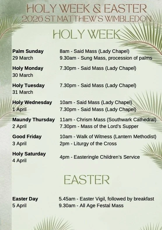 St Matthew’s is OPEN from 9am-5pm daily. You are welcome to come in for some peace and quiet and light a candle. Please join us at our 8am and 9.30am Masses on Sunday, or for the 10am Mass on Wednesday. If you want to talk to a member of the clergy, you can contact the Team Vicar, Revd Alastair Newman, here: vicar@stmatthewswimbledon.org. Please do not hesitate to contact us if we can be of any help to you.